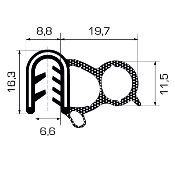 La struttura alveolare della parte in gomma espansa dei profilati è classificata a “microcelle” con alveoli estremamente uniformi e non comunicanti l’uno con l’altro (cosidette "cellule chiuse")